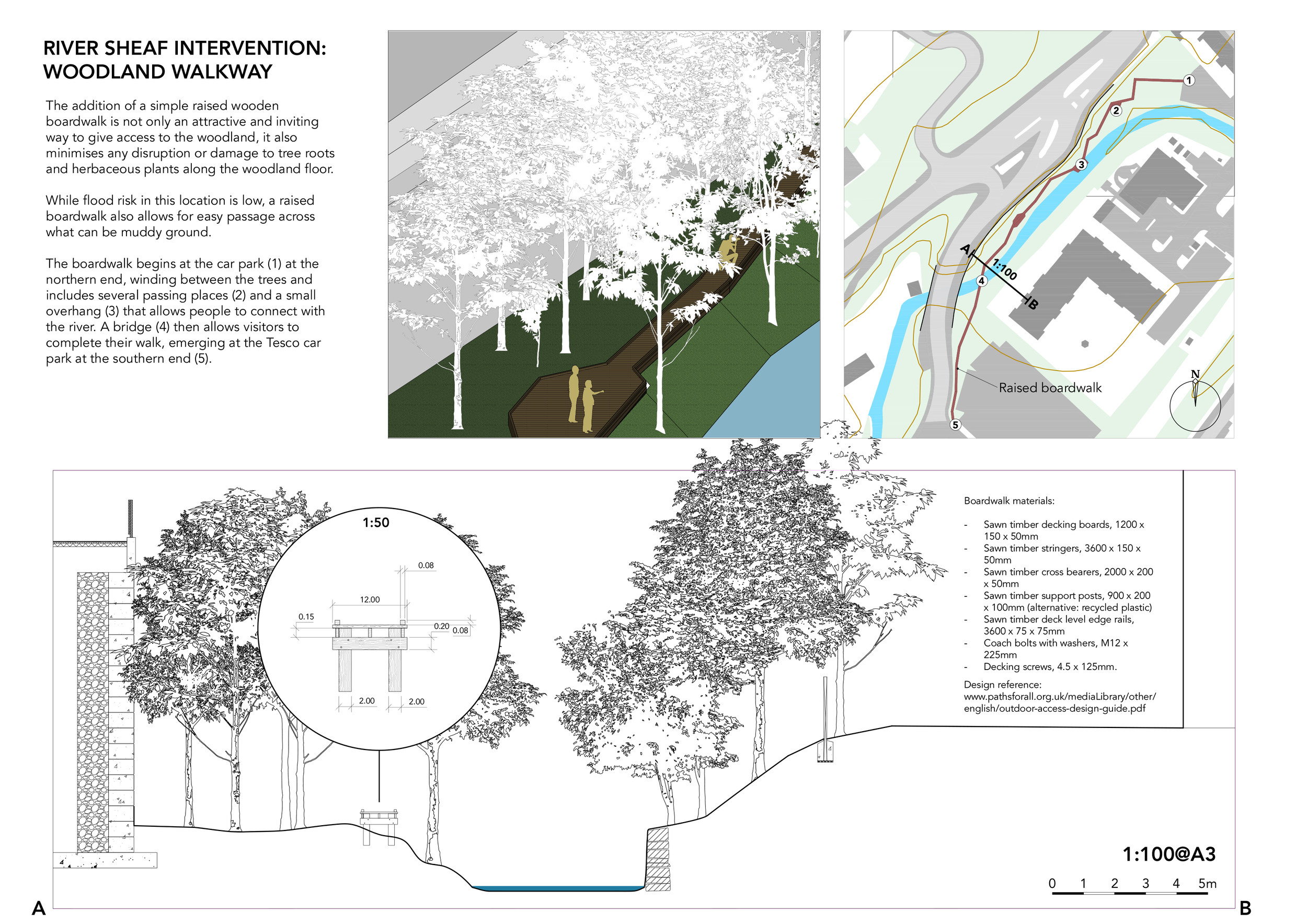 The brief here was to create a simple intervention that would improve access to a short stretch of the River Sheaf, in the south of Sheffield.