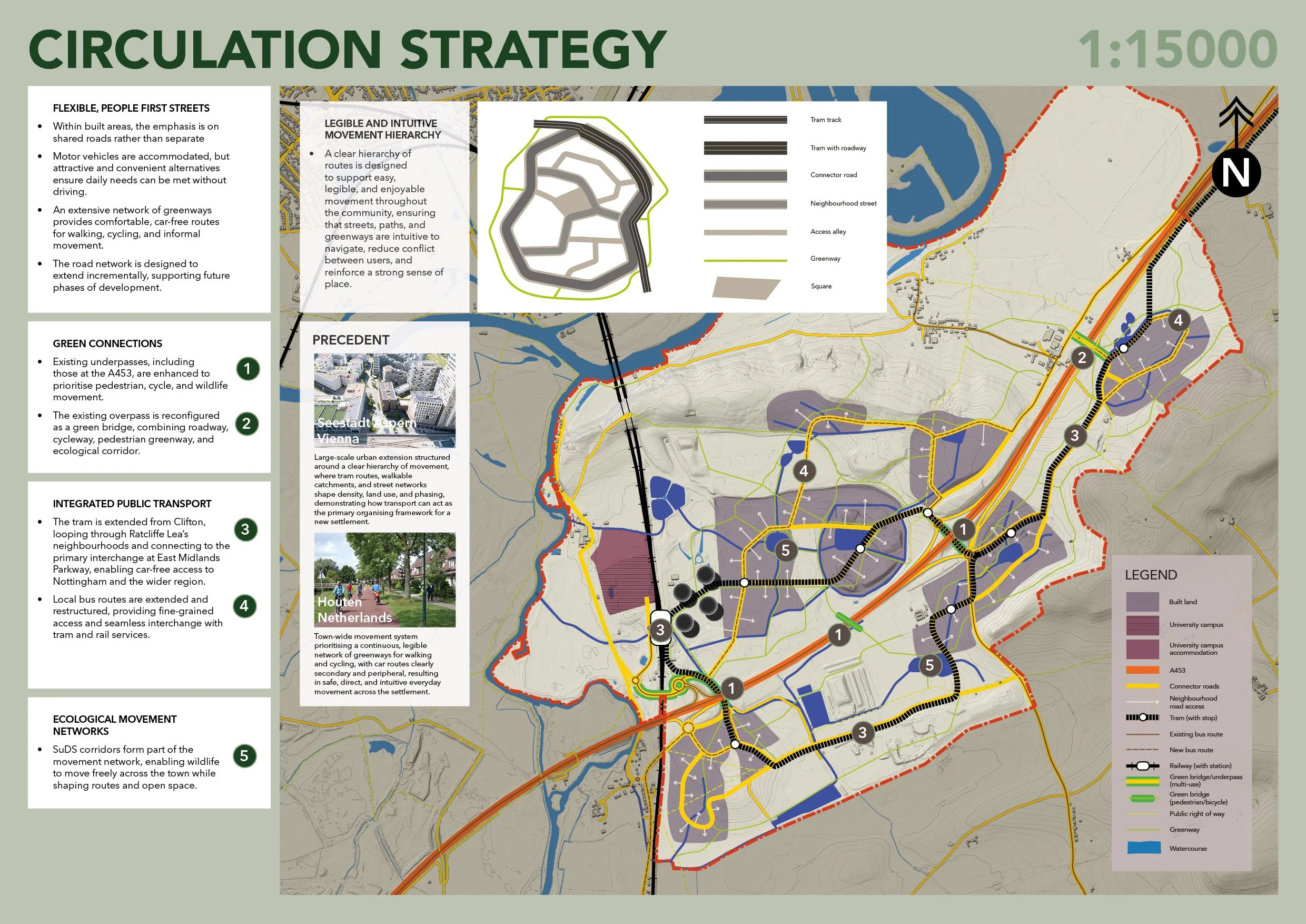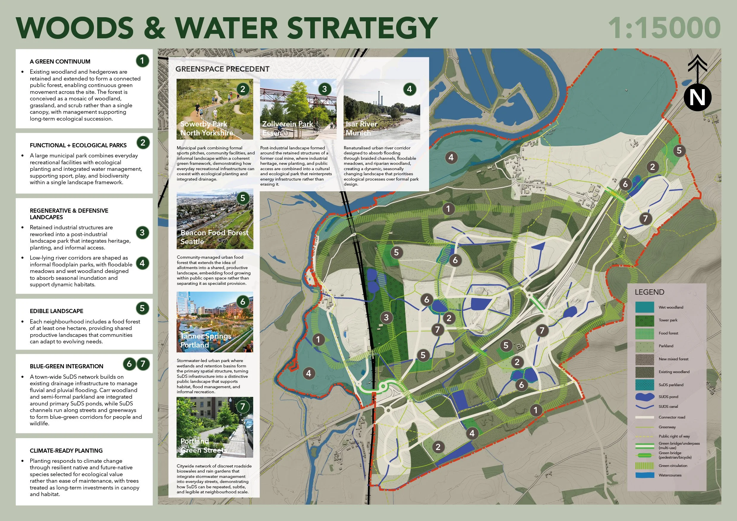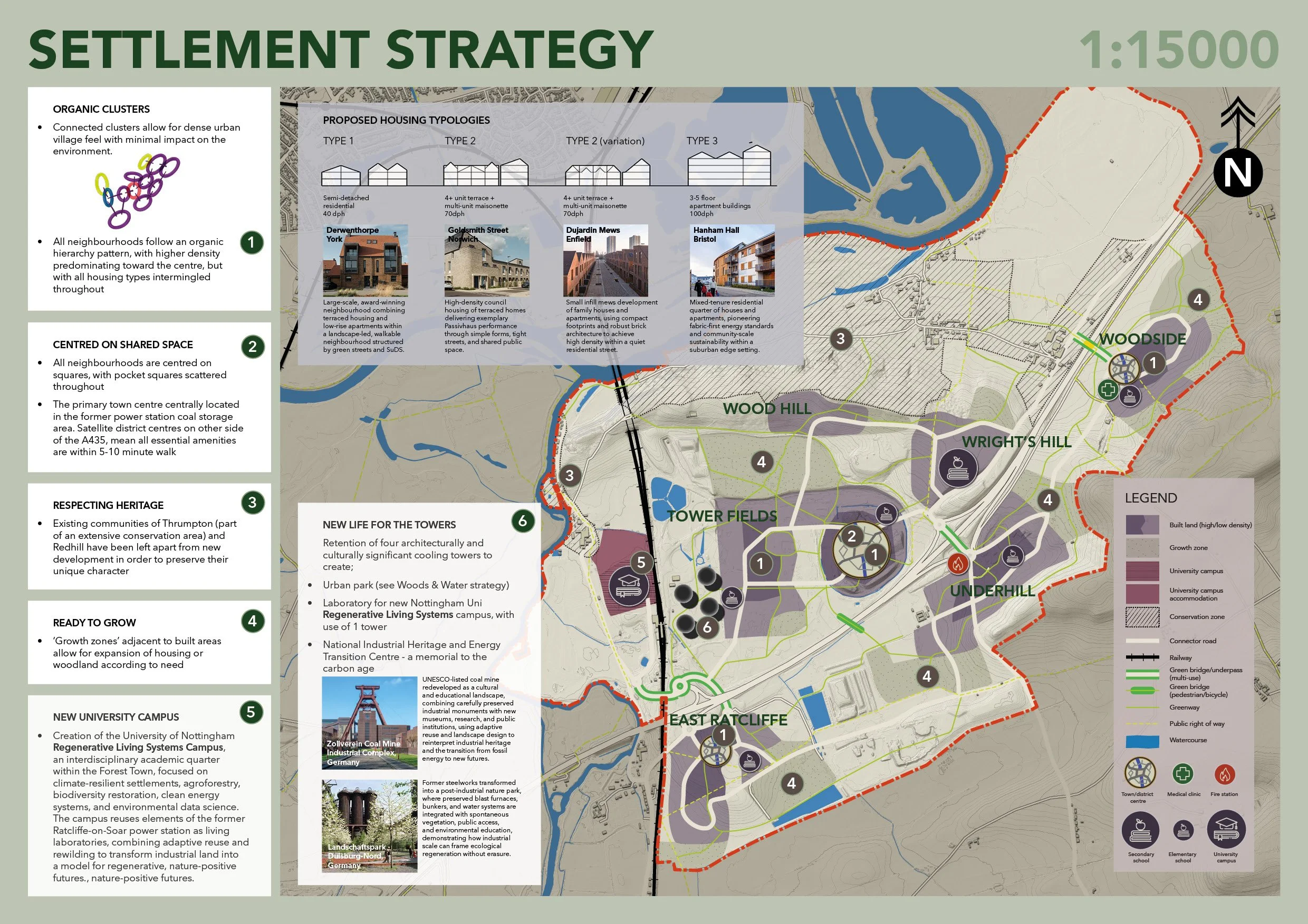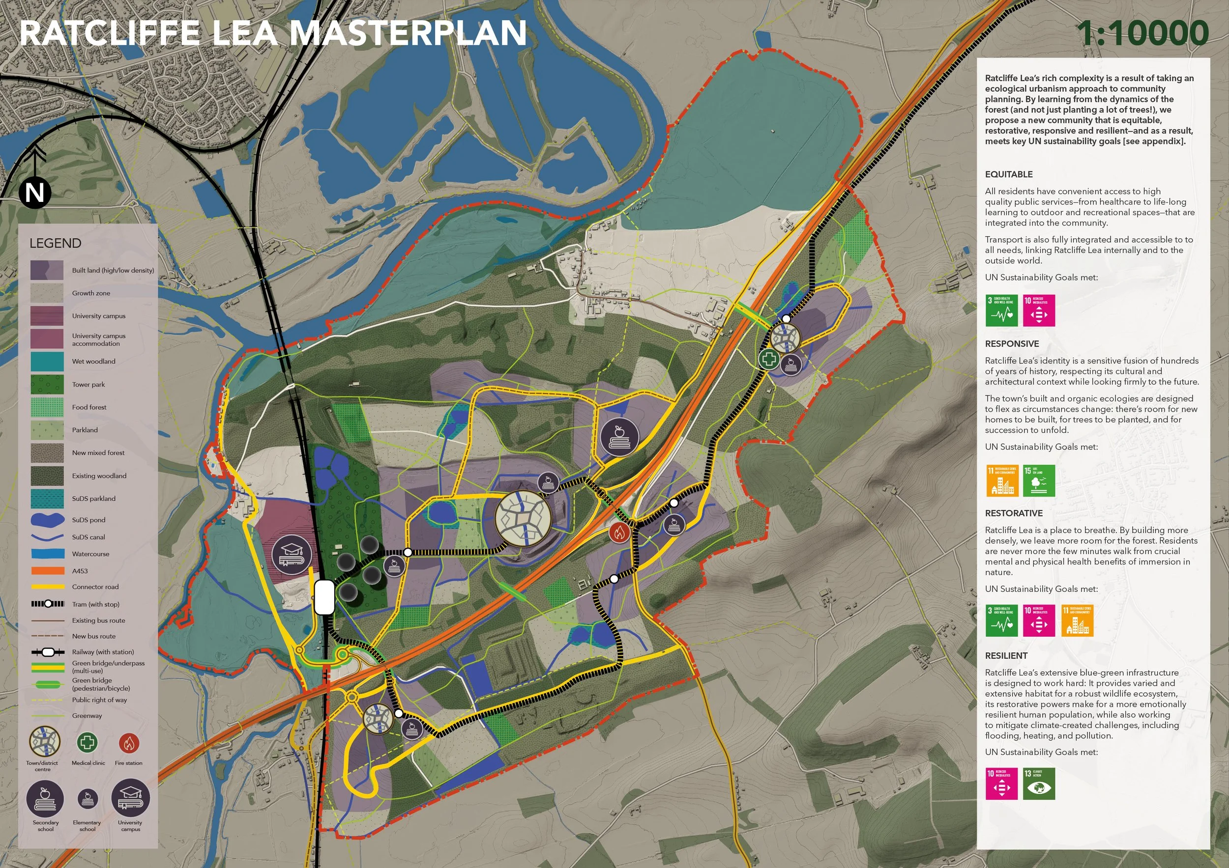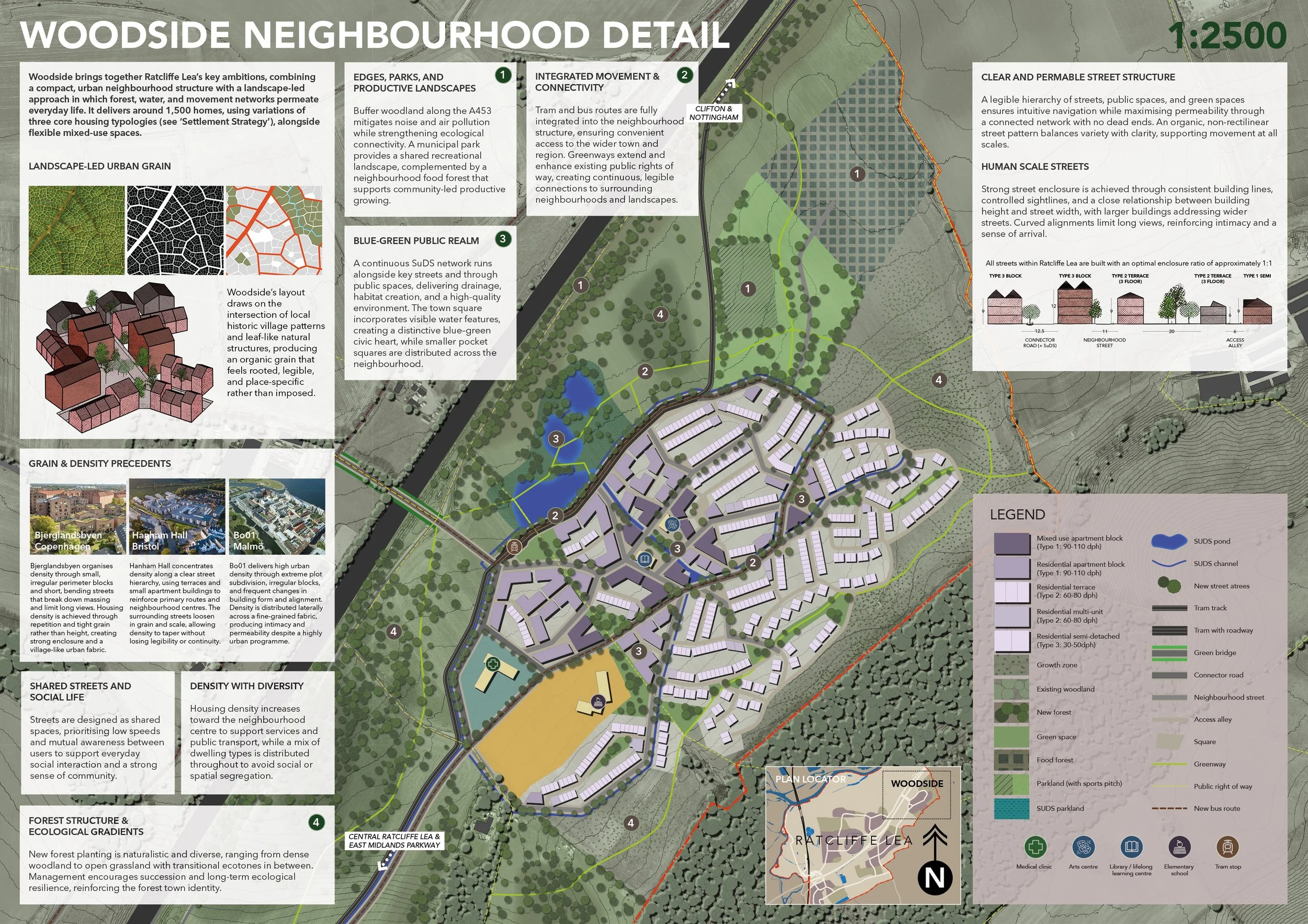 The brief for this project was to transform the former coal-fired Ratcliffe-on-Soar power station into a model for future living. The proposal frames Ratcliffe Lea as the UK’s first “forest town”—a settlement structured by forest logic, not just planted with trees. Density is used to protect and extend a continuous landscape, while movement, water, and urban form are shaped by ecological systems. Existing hedgerows and woodland expand into a connected mosaic, integrated with a site-wide SuDS network of wetlands and floodable spaces. This blue–green framework supports biodiversity, manages flood risk, and defines daily experience. These principles translate into a compact, walkable neighbourhood where green infrastructure, shared streets, and mixed housing create a coherent, socially active place embedded in its landscape.